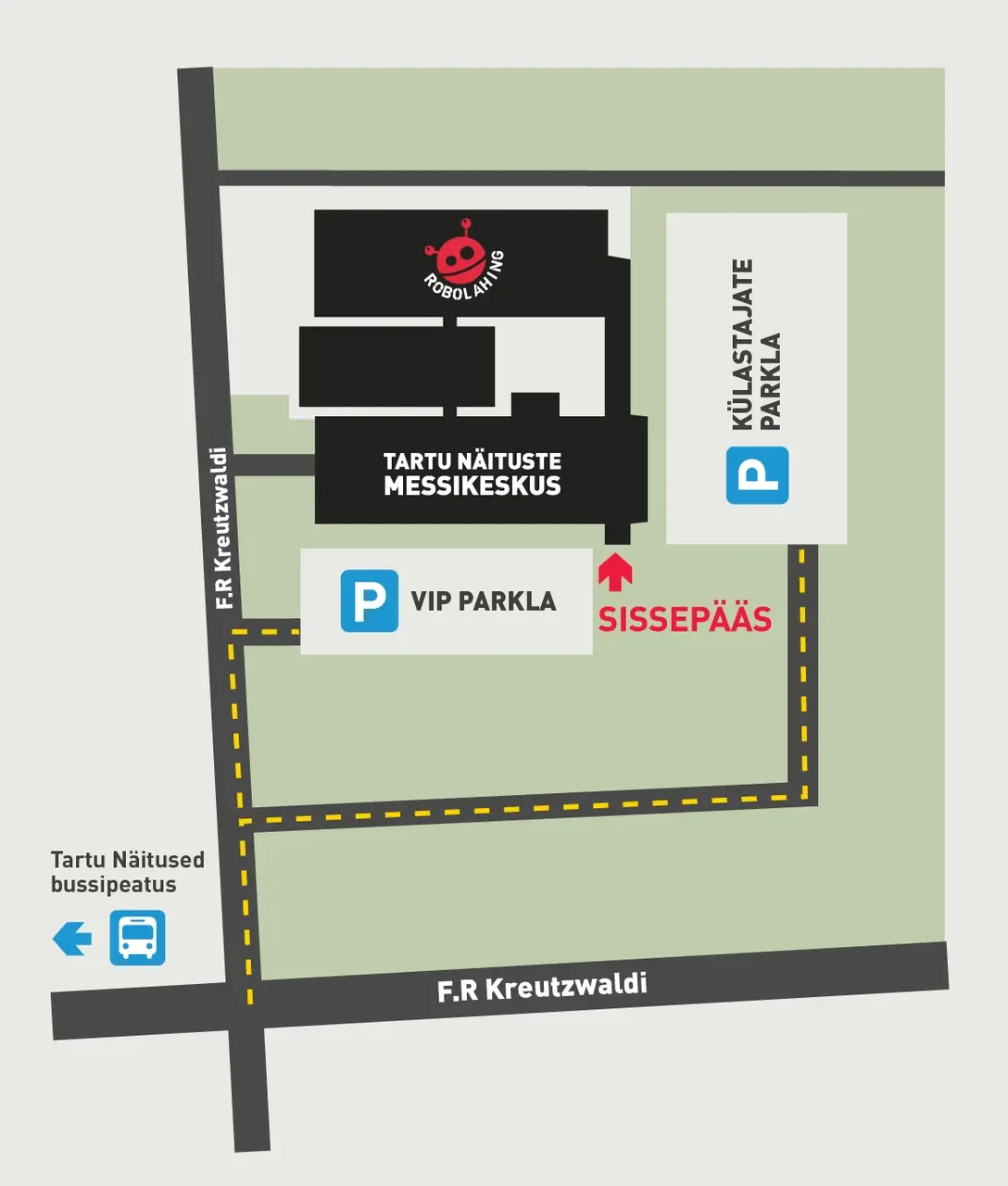 | Parking Parking at Robobattle is free. VIP ticket holders can park in the designated VIP parking area. Follow the posted signs to reach the correct location. | By Bus The closest bus stop to Robobattle is Tartu Näitused. From in front of Tartu Kaubamaja, take bus no. 3 towards Tartu Näitused, and from Tasku Center, bus no. 6. For a detailed bus schedule, visit web.peatus.ee. Enter your starting point and set your destination as Tartu Näitused. |